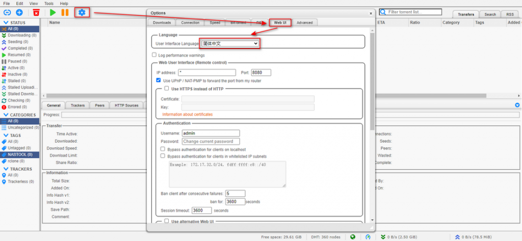 qbit在后台运行后,就可以使用qbit的Web UI了,默认端口8080,记得防火墙打开8080端口