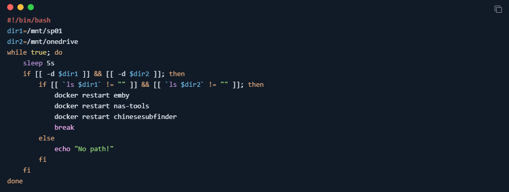 解决方案其实也很简单,只需要一个脚本,我们让他开机启动的是检测下你的挂载目录是否有内容,一旦有内容的话,则重启 docker 容器,如果没内容的话,则循环检测,直到 rclone 挂载成功。