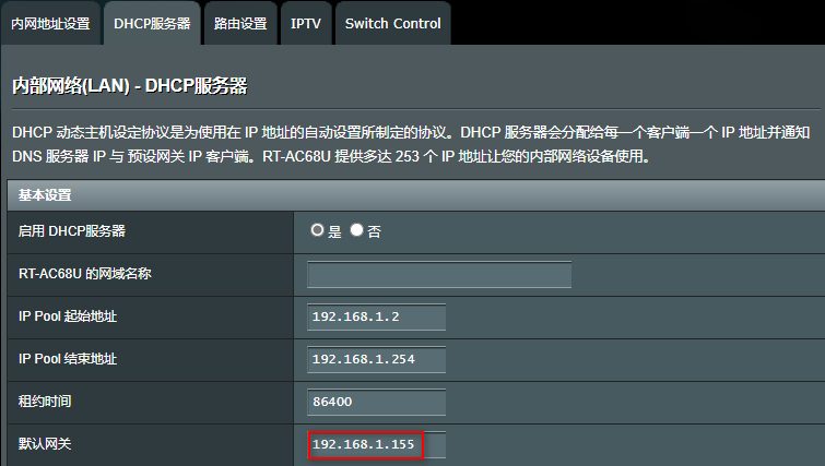 路由器中设置默认网关为192.168.1.155(指向那台电脑)