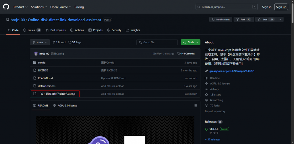 然后去https://github.com/hmjz100/Online-disk-direct-link-download-assistant/下载js文件。