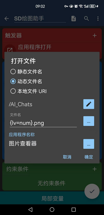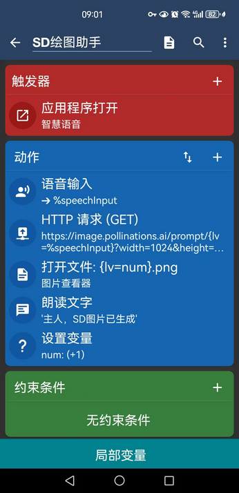 通过以上配置,你就完成了一个简单的“SD绘图助手”宏。它结合了 MacroDroid 的自动化能力与在线 AI 绘图接口的图像生成功能,实现了“语音输入→在线生成→自动查看”的一条龙体验。后续你可以:
